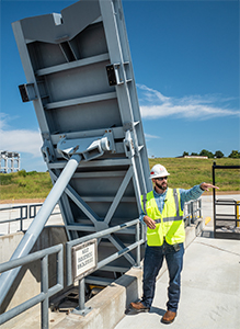 Waylon Humphrey of the U.S. Army Corps of Engineers’ Louisville District describes the operation of Olmsted’s new dam wickets at the facility’s test pit. |