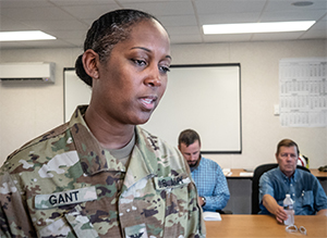 Col. Antoinette Gant, Louisville District commander for the U.S. Army Corps of Engineers, details progress at Olmsted during a media tour of the site in July. |