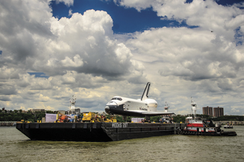 It was the third leg of a journey that began in April, when Enterprise was secured onto a Boeing 747 Shuttle Carrier Aircraft at Washington Dulles International Airport and flown to John F. Kennedy International Airport in New York. The second leg was a barge tow from Jamaica Bay to the Weeks yard in Jersey City, N.J. Along the way, a 35-mph gust of wind blew the barge sideways, causing the starboard wingtip of Enterprise to rub against a wood piling. The damage was superficial and repaired before the shuttle was moved to the Intrepid museum.