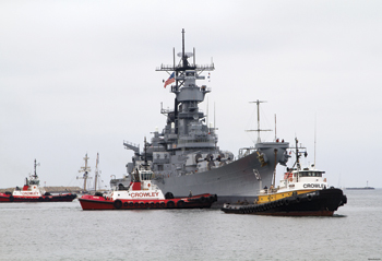 The PBC awarded Crowley Maritime the contract to tow Iowa from the Port of Richmond in San Francisco Bay to Pier 87 in the Port of Los Angeles. Crowley has experience in ocean tows of other retired battleships, notably USS Missouri from Washington to Pearl Harbor in 1998. “The battleship group was a great group to work with,” said Crowley Port Captain Andrew Gauthier. “Very knowledgeable. They really had their ducks in a row. We were fortunate that they chose us because we are the company that has handled the other battleships.”