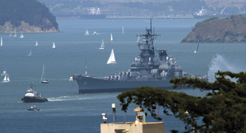 The first leg of the Iowa tow was from Richmond, to anchor four miles off the Port of Los Angeles, where the battleship underwent a hull scraping to rid it of any invasive species or contaminants that might reside there. Three Crowley tractor tugs — Goliath, Delta Billy and Patricia Ann — assisted the 7,200-hp ocean tug Warrior, with a single-point makeup, under the Golden Gate Bridge and out of the bay.