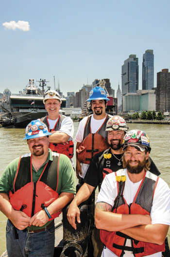 The crew of the tugboat Elizabeth Weeks, clockwise from left foreground, Capt. Ben Peterson, Capt. Dan Smith, AB Matt Nicastro, Engineer Stephen Goodson and Heavy-Lift Supervisor Donny Benesch. |