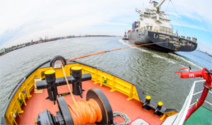 Employing its JonRie Series 250 escort winch, Eric McAllister has a line up to the 758-foot containership Christina Star. |