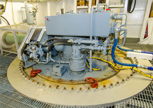 The Hagglunds winch motor that powers Eric McAllister’s JonRie bow winch, which is able to maintain constant tension on the Samson synthetic line. This feature is instrumental in managing the great forces associated with escorting large ships. |