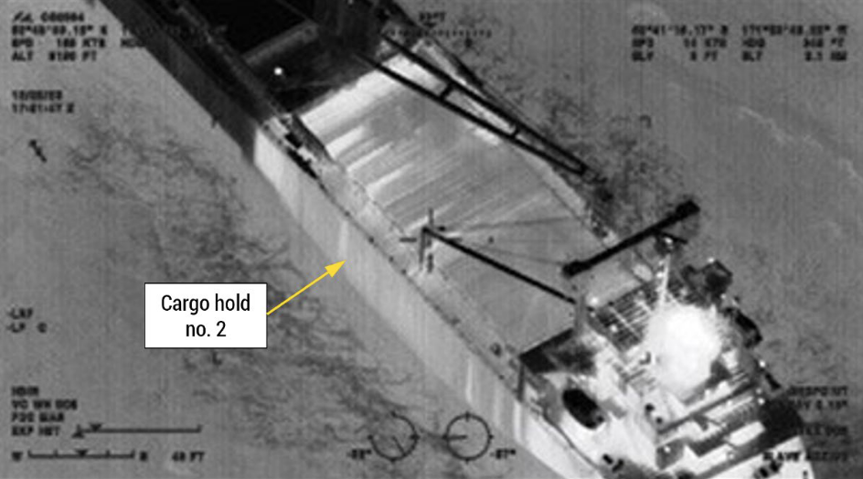 The vessel had encountered gale-force northwest winds of about 26 knots, with gusts above 30 knots and combined seas and swells reaching 19 feet. These conditions caused significant vessel rolling and seawater to wash over cargo hatches.