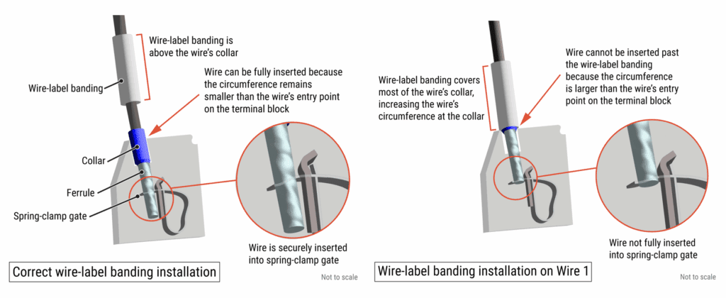 At Tuesday’s public meeting at NTSB headquarters, investigators said the loose wire in the ship’s electrical system caused a breaker to unexpectedly open – beginning a sequence of events that led to two vessel blackouts and a loss of both propulsion and steering near the 2.37-mile-long Key Bridge on March 26, 2024. Investigators found that wire-label banding prevented the wire from being fully inserted into a terminal block spring-clamp gate, causing an inadequate connection.