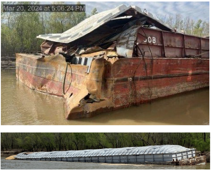 (WASHINGTON) — On March 16, 2024, about 0008 local time, the towing vessel Chad Pregracke was transiting southbound on the Lower Mississippi River pushing 34 loaded barges near mile 260.6, about 5 miles east of New Roads, La. The barge PTC 706 at the head of the tow rapidly sank, causing the tow to break apart.