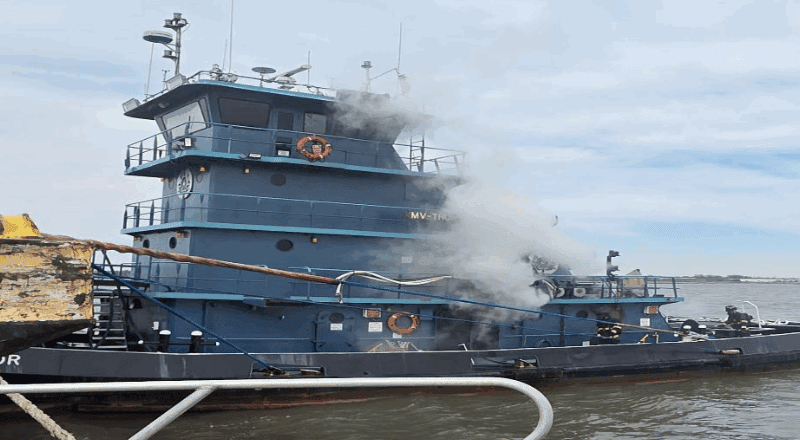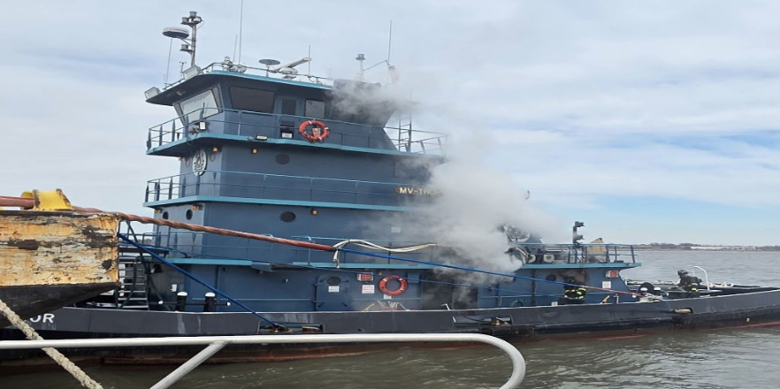 (WASHINGTON) — On Feb. 18, 2025, at about 9:25 a.m., the towing vessel Thor was pushing two barges downbound on the Delaware River, 1.5 miles downriver of New Castle, Del., when a fire broke out in the engine room. Four crewmembers isolated the fire to the engine room and subsequently abandoned ship to a nearby tugboat.